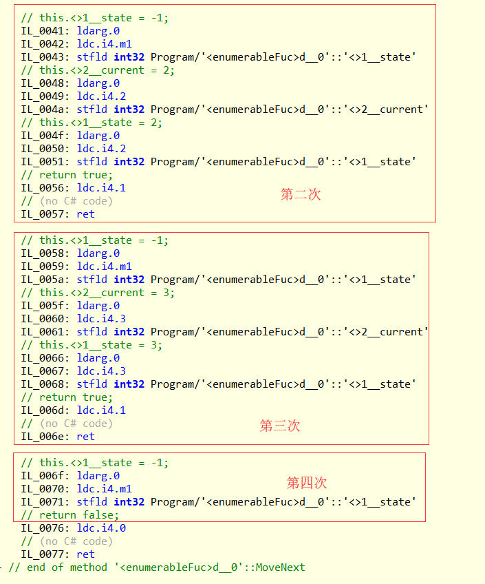每次调用MoveNext()函数都会将state加1,一共进行了4次迭代,前三次返回true,最后一次返回false,代表迭代结束。这四次迭代对应被3个yield return语句分成4部分的enumberableFuc()中的语句。