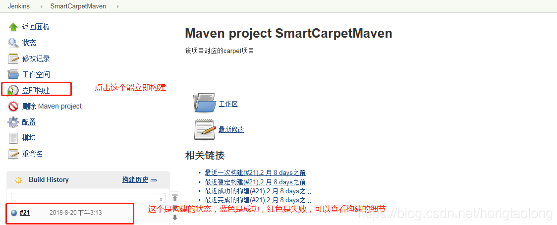 好了,到了上面基本上配置完成了,当然还可以配置的更加完善,比如构建完成之后发送邮件、以及部署到多个服务器的tomcat中,那些就不介绍了。配置完成之后呢就可以在点击构建了