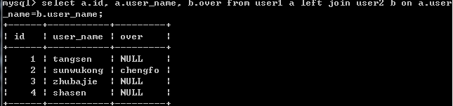 select a.id, a.user_name, b.over from user1 a left join user2 b on a.user_name=b.user_name;