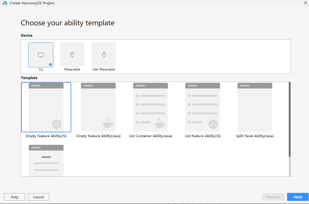 打开DevEco Studio,在欢迎页点击Create HarmonyOS Project,创建一个新工程。选择设备类型和模板,以Wearable为例,选择Empty Feature Ability(Java),点击Next