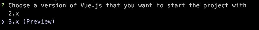 这里选择 vue 的版本,直接选择 3.x 回车即可。这样就能创建一个基于 vue3 搭建的项目了。