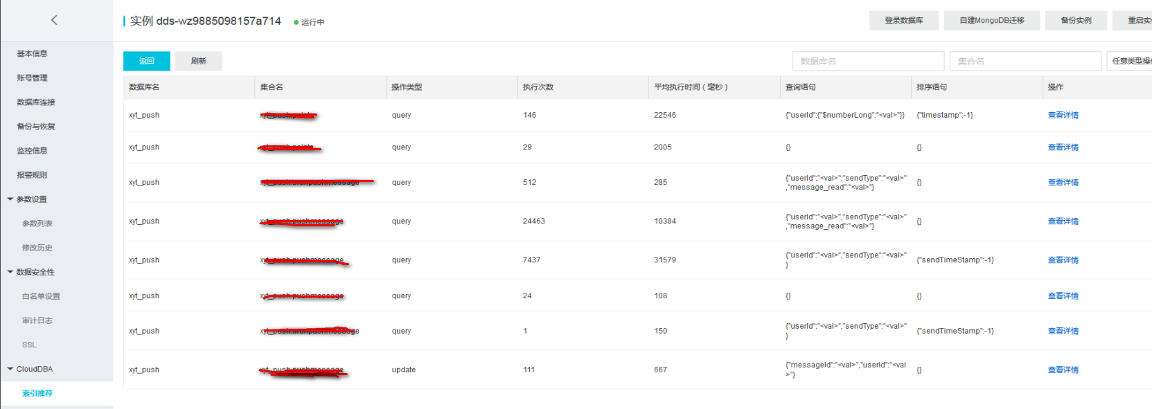 3.知道是Mongodb出问题,就好办了,阿里云里面有个索引推荐,很好用的,会给出查询时间,执行次数,和推荐策略