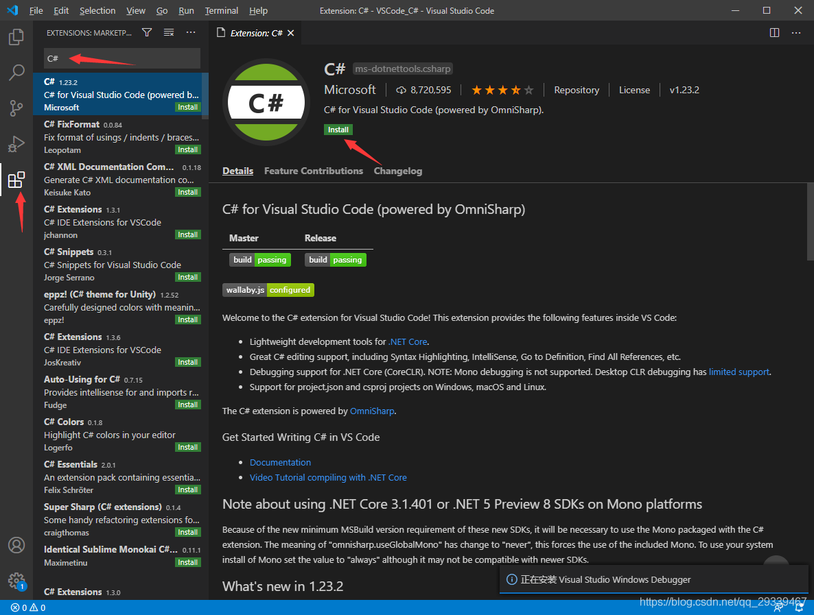 下载安装C#插件,安装完成后重启一下VSCode