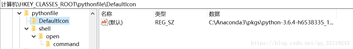 DefaultIcon则是设置文件显示的图标,在Anaconda目录下找到py文件的图标将路径填入(修改完后如果图标没有改变,在文件资源管理器中输入图标路径打开,图标就刷新了——这是什么鬼机制?)