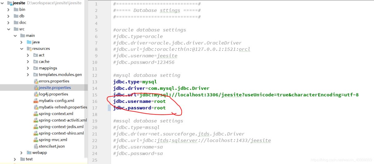 3. 修改 jeesite\jeesite\src\main\resources\jeesite.properties 中的数据库用户名和密码,改成自己电脑的即可,如果有提示需要MAVEN下载jar包,选择auto那个。jeesite.properties 配置文件最下面有个被注释掉的工程路径配置,那个不要管,不要按官方文档说明去修改 !