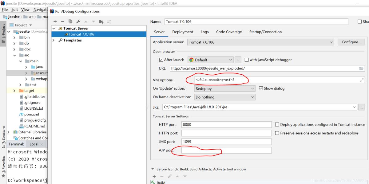 6.提示“BUILD SUCCESS"时,配置tomcat7.0。AJP port那一栏要为空,JVM那边要填上 -Dfile.encoding=UTF-8