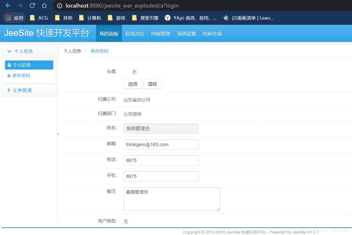 8. 浏览器进入“127.0.0.1:8080/jeesite",输入用户名 thinkgem 和密码 admin 即可正常访问