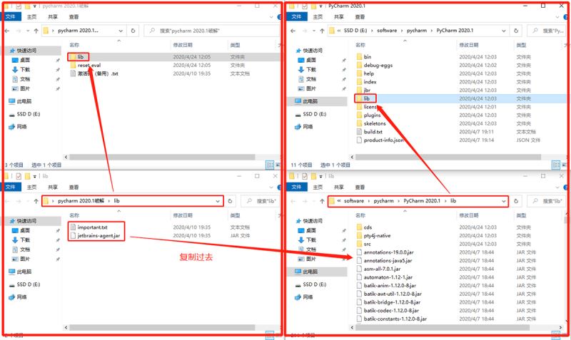 3.解压上述文件后,可以看到有lib文件夹、reset eval文件夹、激活码,打开 lib文件夹,把important.txt和jetbrains-agent.jar复制到pycharm2020.1的安装路径的lib文件夹中