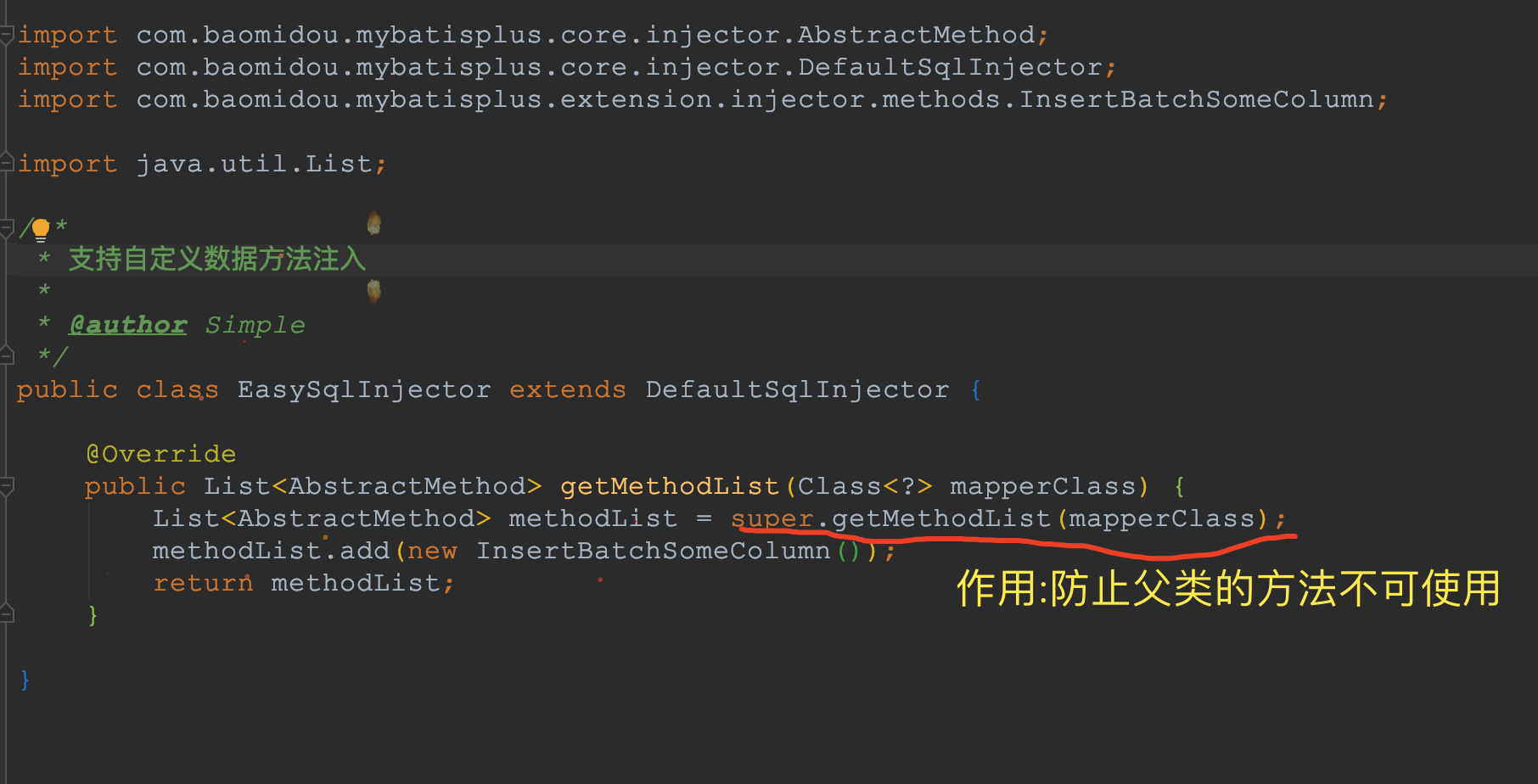 我们阅读mybatis-plus的源码,在com.baomidou.mybatisplus.extension.injector.methods.InsertBatchSomeColumn包中其实是有批量插入代码实现的,这里我就不贴源码了,大家自行跟踪一下.我们来手工扩展一下: