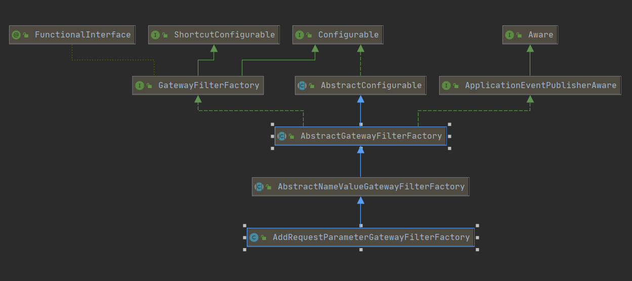 首先看看AddRequestParameteGatewayFilterFactory的继承关系,大概了解一下他的组成