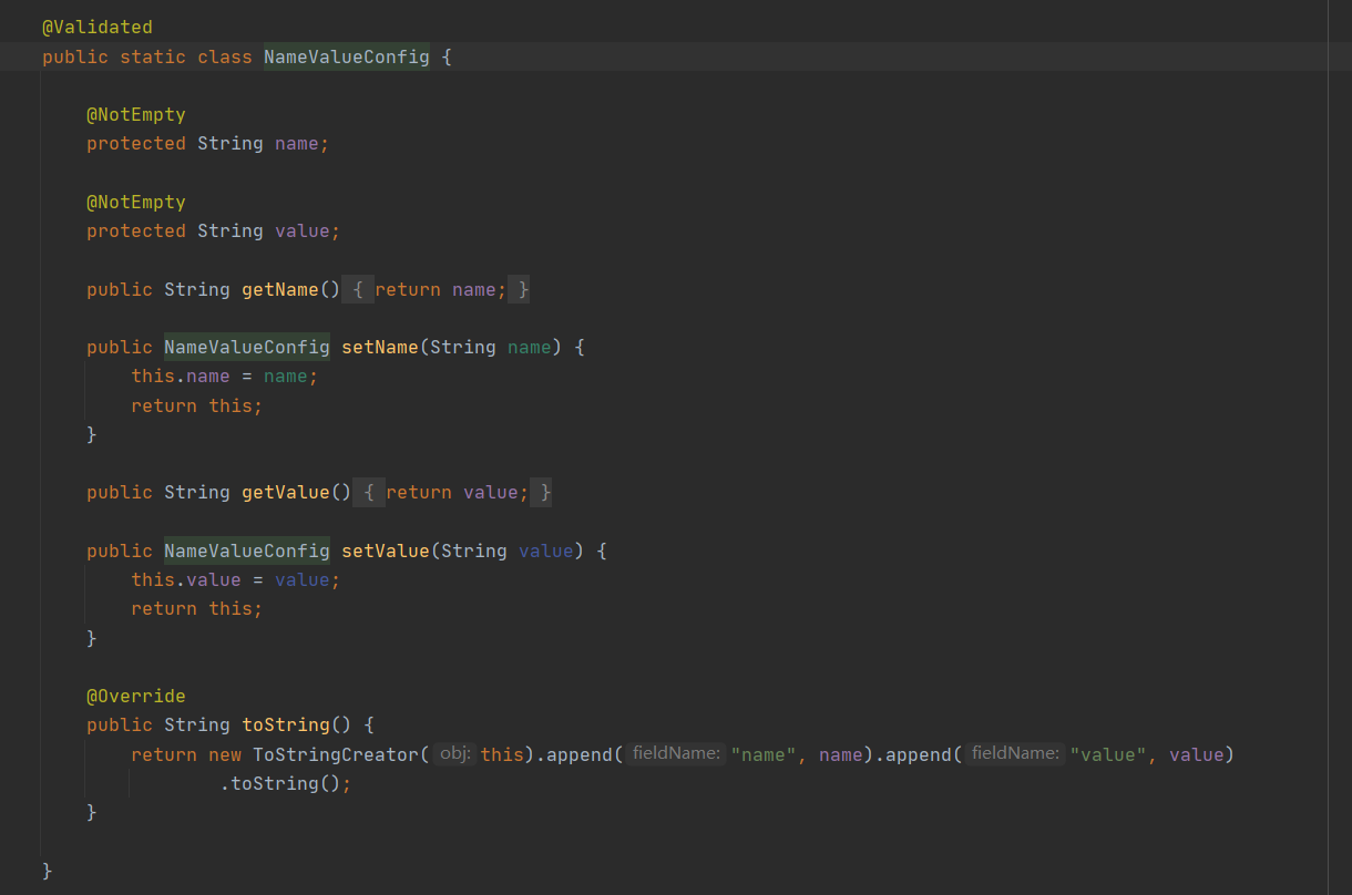 可以看到,config类的实现就是一个name 和value,分别对应了配置文件中的两个参数。