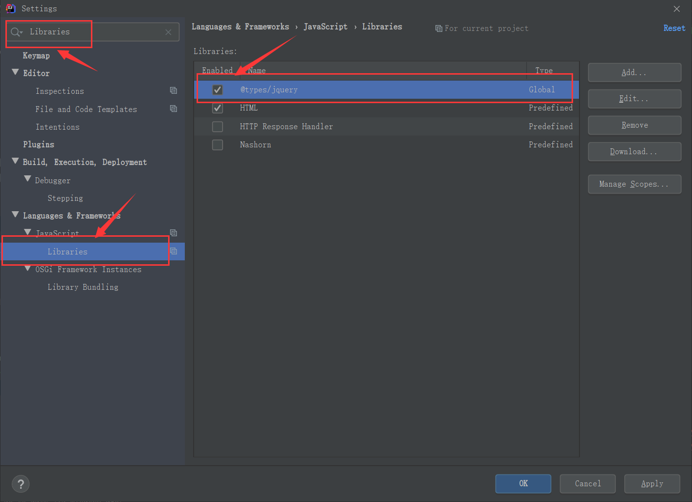 第二步:在搜索框输入:Libraries,在右侧@types/jquery前面打勾然后点击右下角的apply,然后再点击OK即可。