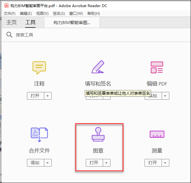 首先用Adobe Acrobat Reader打开一个PDF文档,然后找到对也给你的工具选项卡,选择图章功能,如下图所示。