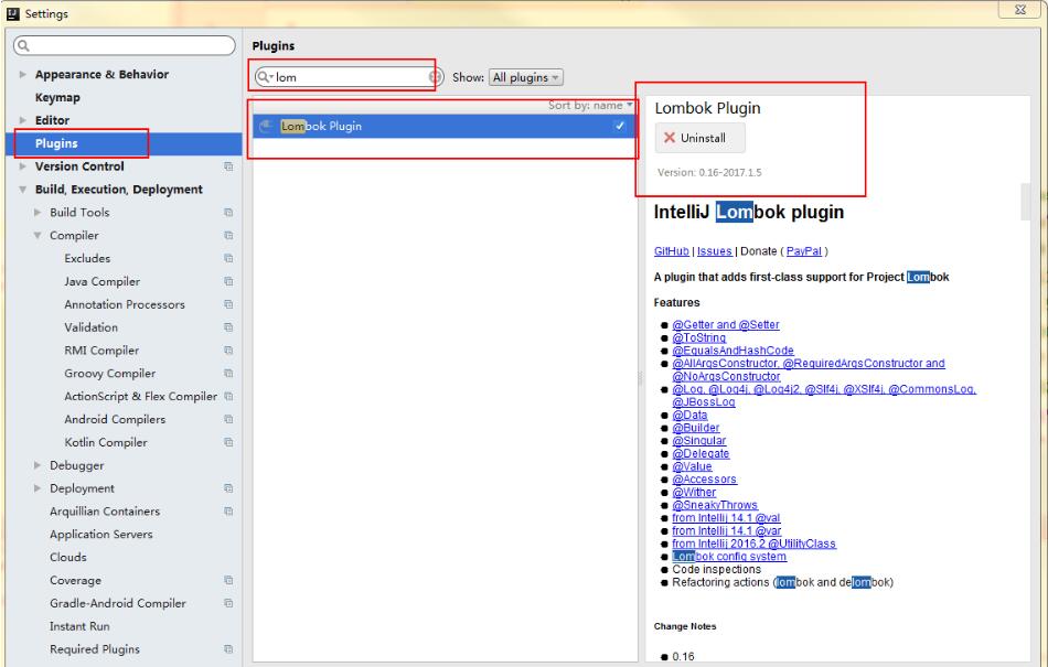 步骤:File ——》Settings——》Plugins. 搜索lombok,点击安装install。然后会提示重启,重启。