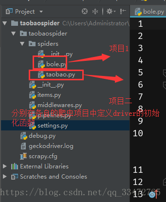 2、如果存在两个或两个以上爬虫项目(如下图项目结构)的时候,需要将driver的初始化函数定义在各自的爬虫项目文件下(如上述代码),同时需要在process_requsests判断是那个爬虫项目的请求!!