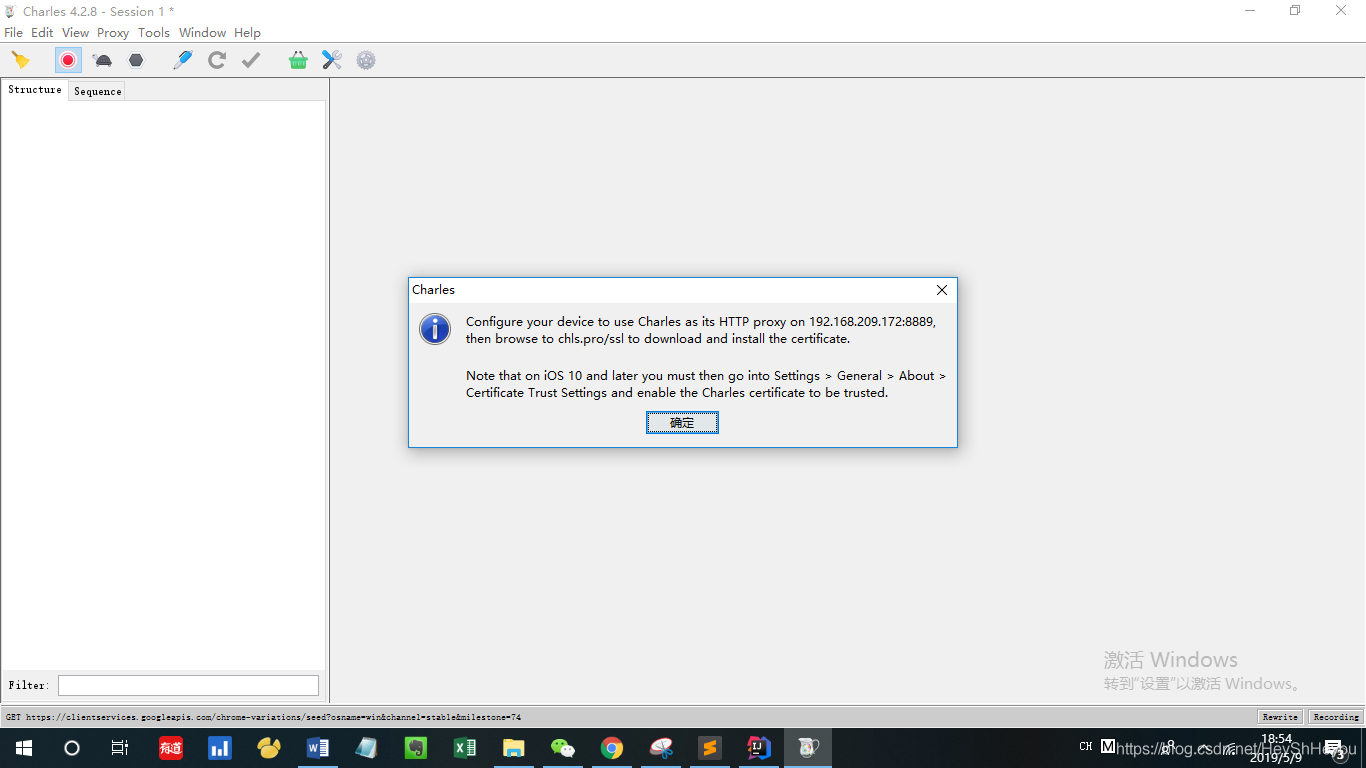 提示需要设置手机http代理为192.168.131.24,端口为8888,然后在手机浏览器上访问 chls.pro/ssl 下载安装证书。如果IOS 版本在10以上,必须在设置->通用->关于本机->证书信任设置中打开对根证书启用完全信任。