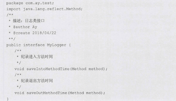 • savelntoMethodTime : 记录进入方法的时间。 • saveOutMethodTime : 记录退出方法的时间。 接口类MyLogger 开发完成之后,用MyLoggerlmpl 类实现它, 具体代码如下:
