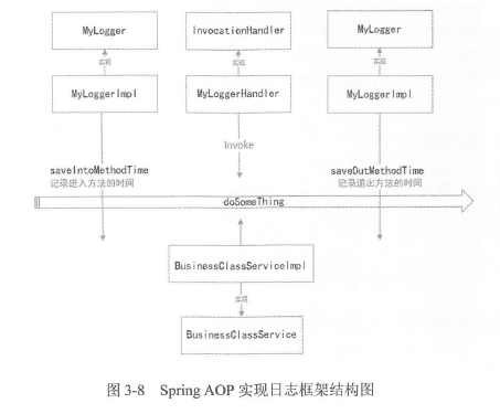 实现类BusinessClassServicelmpl 实现了BusinessClassServ ice 接口, 并实现了doSomeThing 方法,在方法中打印“ do something ......” 。接着,开发日志接口类My Logger , 具体代码如下: