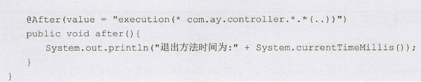 • @Aspect : 标识Loglntercepto r类为一个切面,供容器读取. • @Before : 在所拦截方法执行之前执行before 方法。 • @After:在所拦截方法执行之后执行after方法。 • @Around :可以同时在所拦截方法的前后执行一段逻辑。 • execution 切入点指示符: 表示在controller 包中定义的任意方法 的执行。execution 切入点指示符执行表达式的格式如下:
