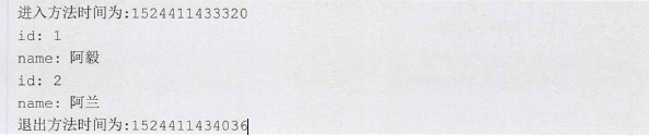 切面类Loglnterceptor 开发完成之后, 重新启动springmvc-mybatis-book 项目,项目成功启 动后,在浏览器输入网址: http: //localbost: 8080/user/findAll , 便可以在lntellij IDEA 开发工具的 控制台看到如下的打印信息: