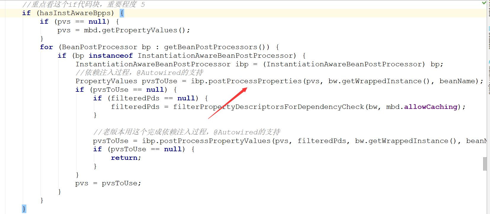 这里又是一个 BeanPostProcessor 类型接口的运用, 前面我们讲到了@Resource@Autowired 注解的收集, 那么这个方法就是根据收集到的注解进行反射调用。