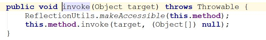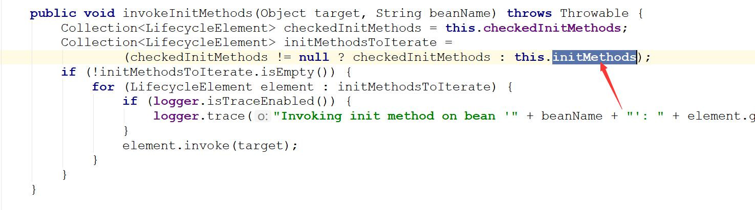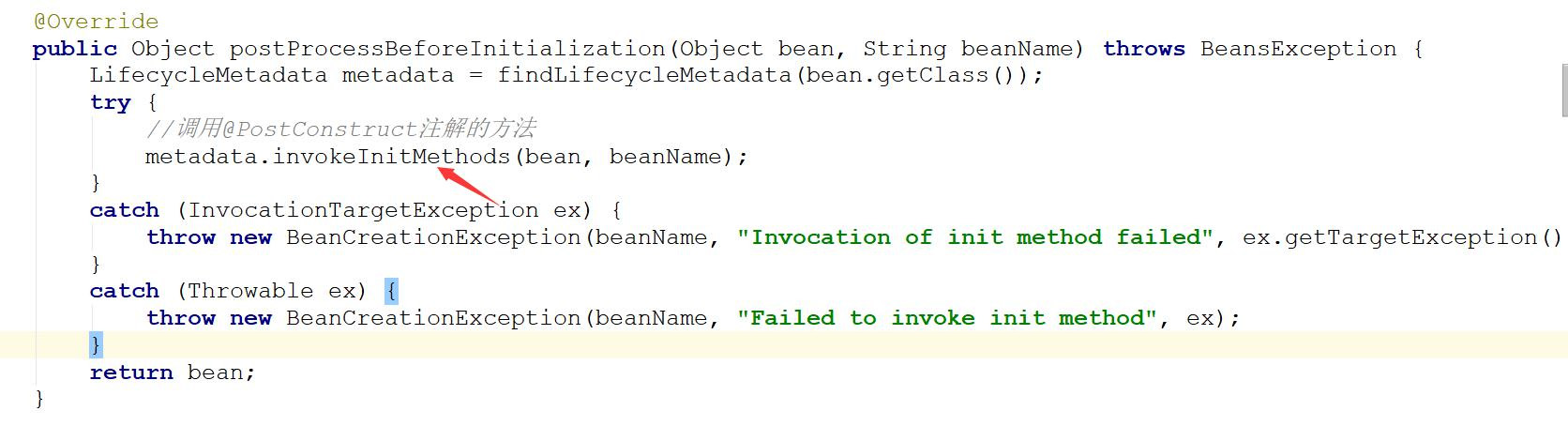 这里又是一个 BeanPostProcessor 接口的运用,前面讲过, 有@PostConstruct 注解的方法会收集到一个 met就是通过 BeanPostProcessor 接口调到CommonAnnotationBeanPostProcessor 类, 然后在类中拿根据对象里面的容器来反射调用有注解的方法。 代码如下: