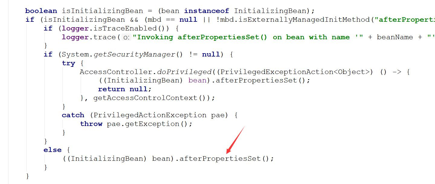 afterPropertiesSet和Init-method和有@PostConstruct注解的方法其实核心功能都是一样的, 只是调用时序不一样而已, 都是在该类实例化和 IOC 做完后调用的, 我们可以在这些方法中做一些在 spring 或者 servlet 容器启动的时候的初始化工作。 比如缓存预热, 比如缓存数据加载到内存, 比如配置解析, 等等初始化工作。