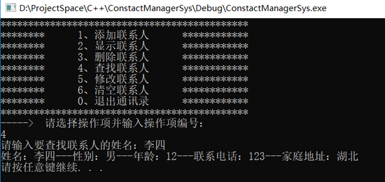 cout << "******** 4、查找联系人 ************" << endl;