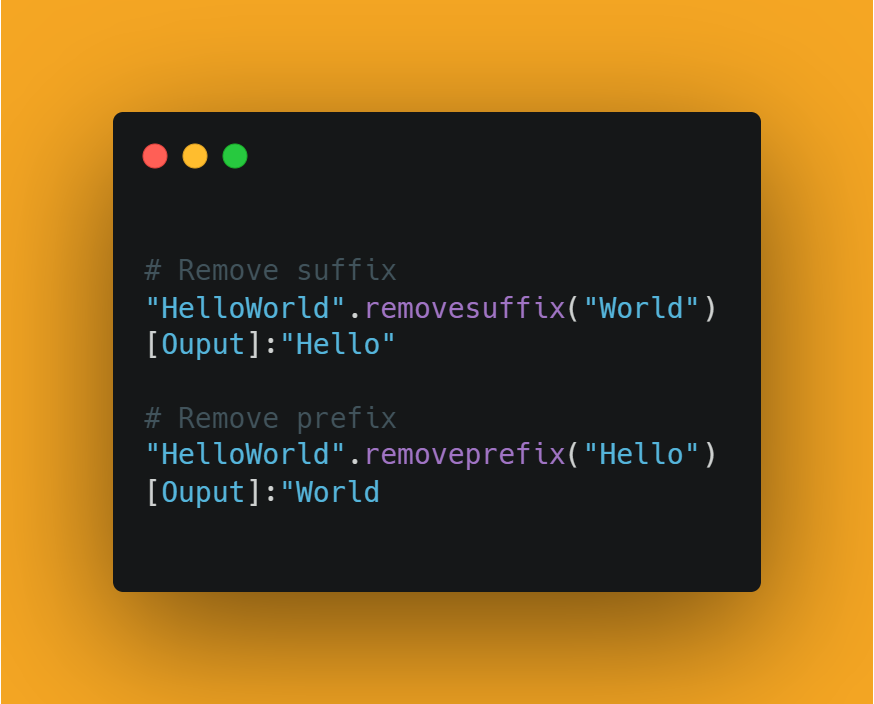str.removesuffix(substring:string)字符串方法:如果str以其结尾,则返回带有修改过后缀的新字符串,否则它将返回原始字符串。