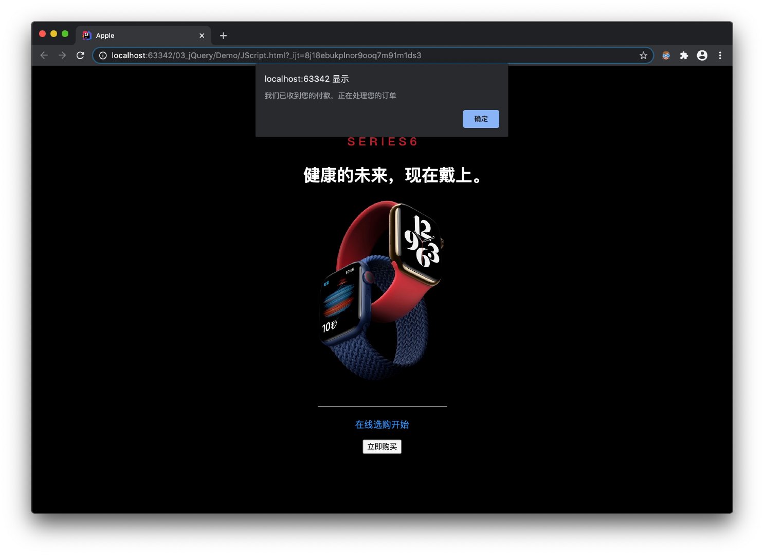 alert("我们已收到您的付款,正在处理您的订单");