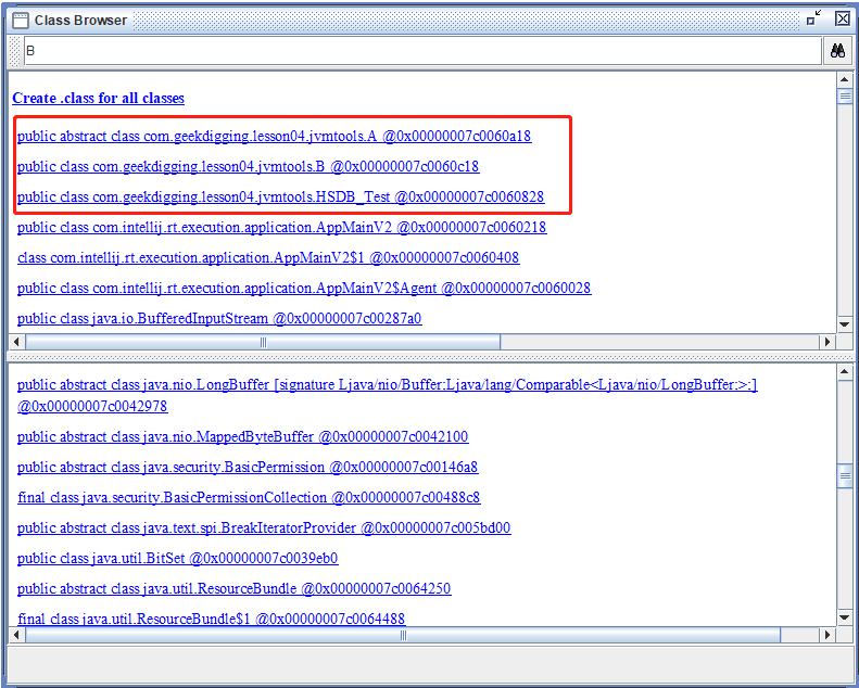 图中红框框起来的是我自己写的三个类,可以看到我这里 B 的内存地址是 0x00000007c0060c18 。
