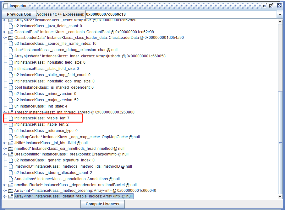 那么我们可以开始计算, vtable 是在 instanceKlass 对象实例的尾部,而 instanceKlass 大小在 64 位系统的大小为 0x1B8 ,因此 vtable 的起始地址等于 instanceKlass 的内存首地址加上 0x1B8 等于 7C0060DD0 。