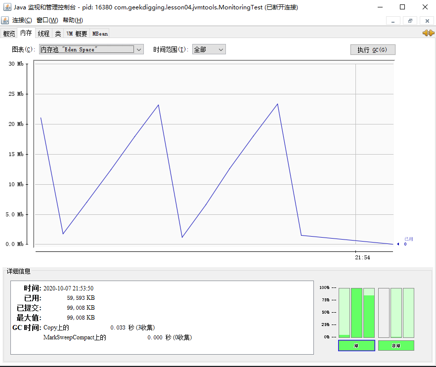 切换到内存标签页,查看 Eden 后可以发现,整个 Eden 的图形是一个折线: