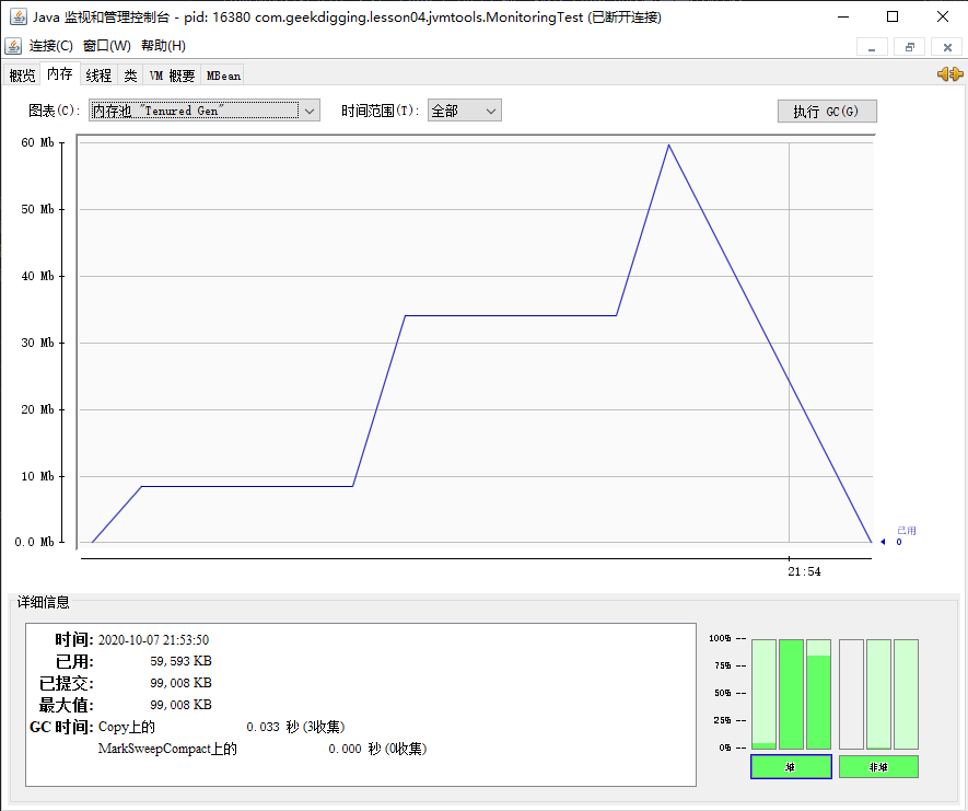可以看到在最后进程结束的时候, Gen 的柱状图已经没有内存占用了,内存回收成功。
