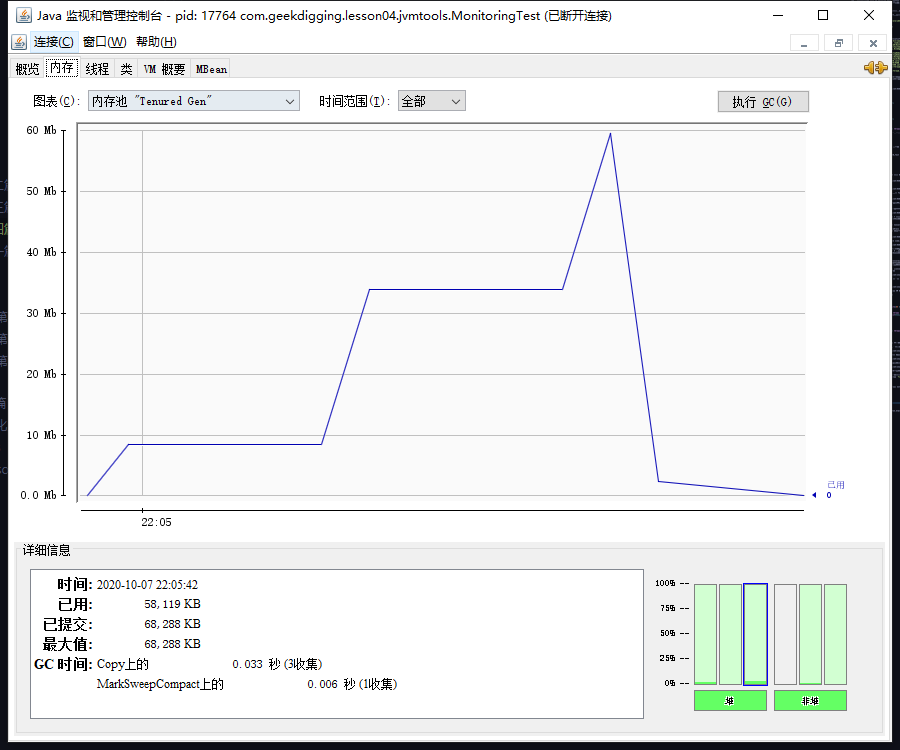 这个案例是使用大约 64KB/50ms 的速度向 Java 堆中填充数据,一共填充 1000 次。