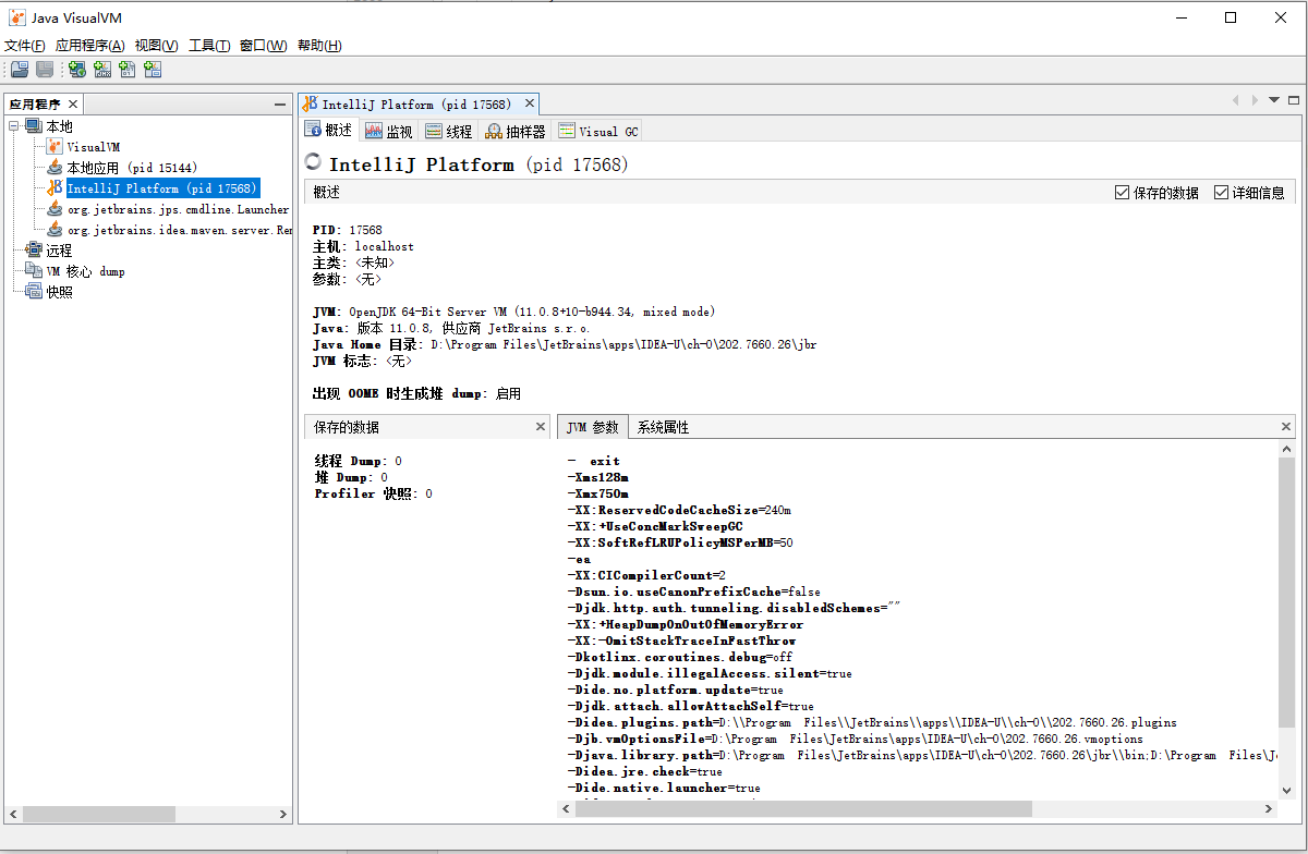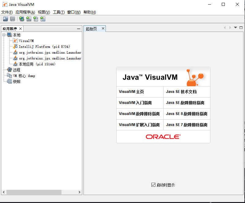 VisualVM 同样在 JDK/bin 这个目录下,双击 jvisualvm.exe 即可运行。在启动之后,直接在左侧会显示当前在本机运行的所有虚拟机进程。