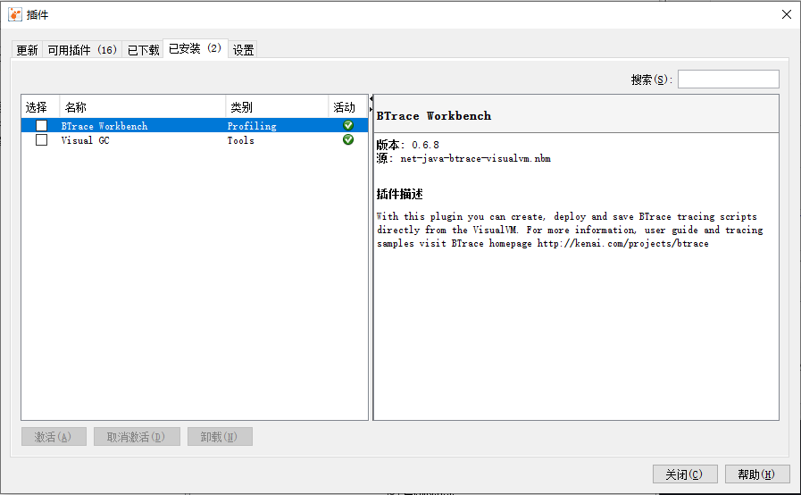我这里只安装了两个最常用的,一个是 GC 监控的插件,还有一个可以动态插入调试程序的插件。
