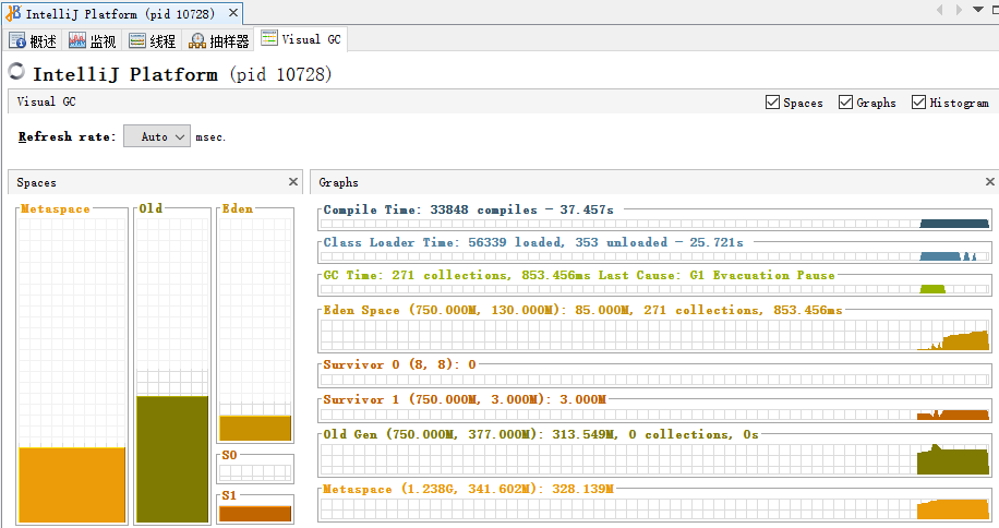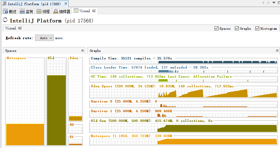首先我们启动 IDEA ,直到 IDEA 可以正常操作,看下 VisualVM 的 GC 监控。