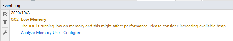 可以看到, Full GC 整整发生了 46 次,并且耗时超过了 21s ,而且这是 IDEA 的界面上也开始弹出警告,警告我们内存不足了,需要调整。