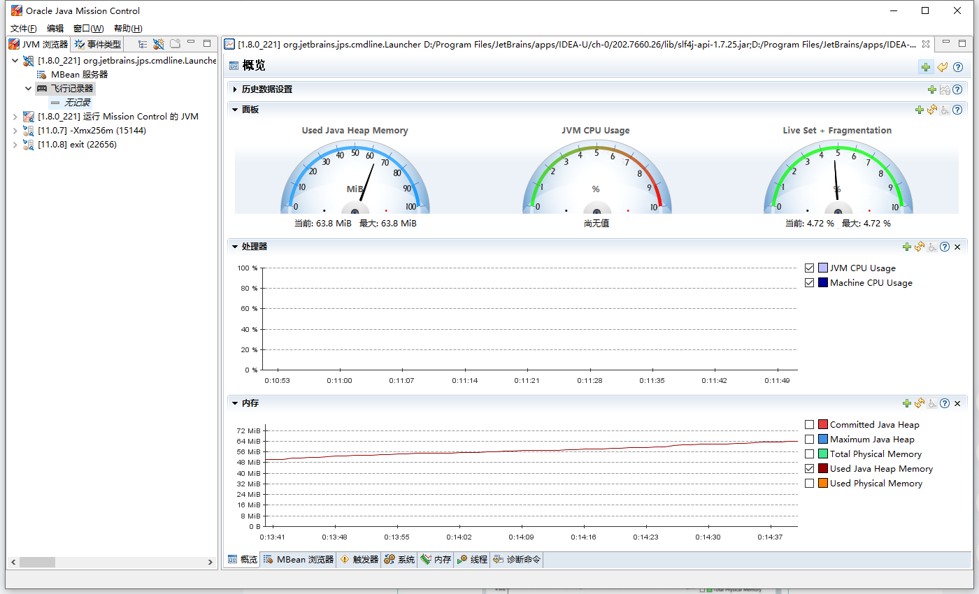 打开后在 JVM 浏览器面板中有两个选项,一个是 MBean ,一个是 JFR 飞行记录器。