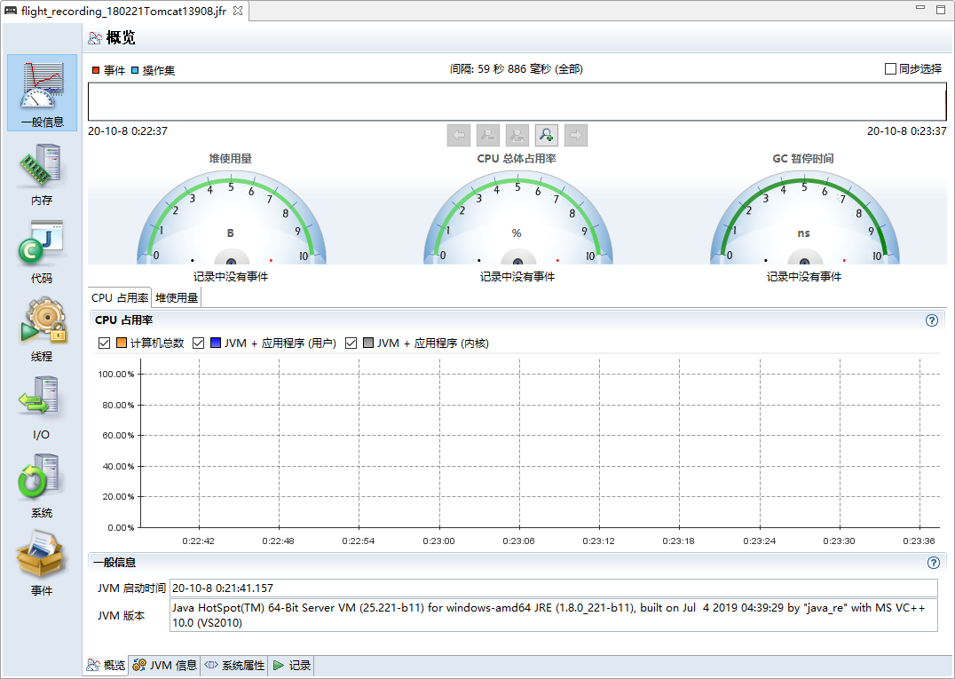 在启动过程中, Class 加载消耗了 28s 左右,而 Class 编译则消耗了 35s 。并且在这个过程中, Minor GC 被触发了 149 次,消耗只有 713ms ,我们更加关注的 Full GC 更是一次都没有触发,消耗为 0 。
