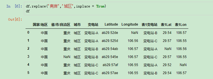 这样Python就会搜索整个DataFrame并将文档中所有的南岸替换成了城区(要注意这样的操作并没有改变文档的源数据,要改变源数据需要使用inplace = True)。