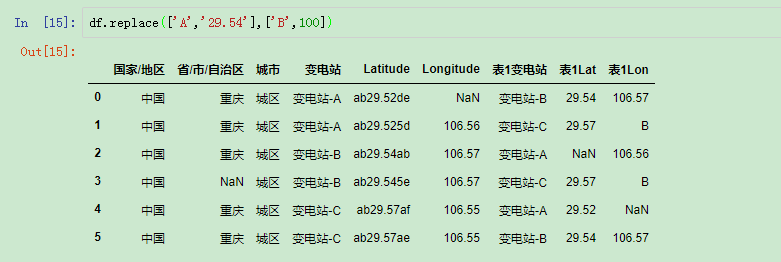 当然,我们也可是使用列表的形式进行替换:df.replace(['A','29.54'],['B',100])