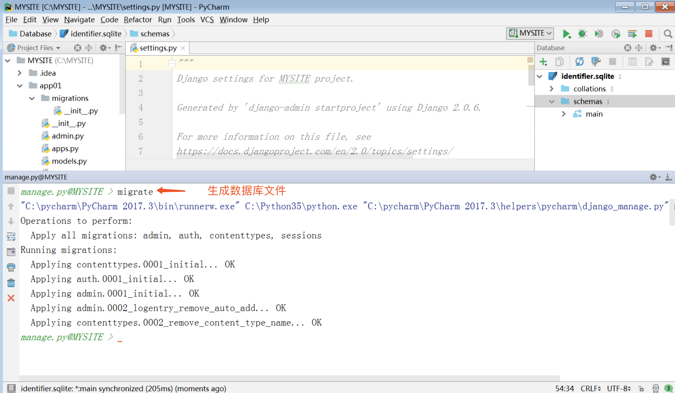 相当于 在该app下建立 migrations目录,并记录下你所有的关于modes.py的改动,比如0001_initial.py, 但是这个改动还没有作用到数据库文件