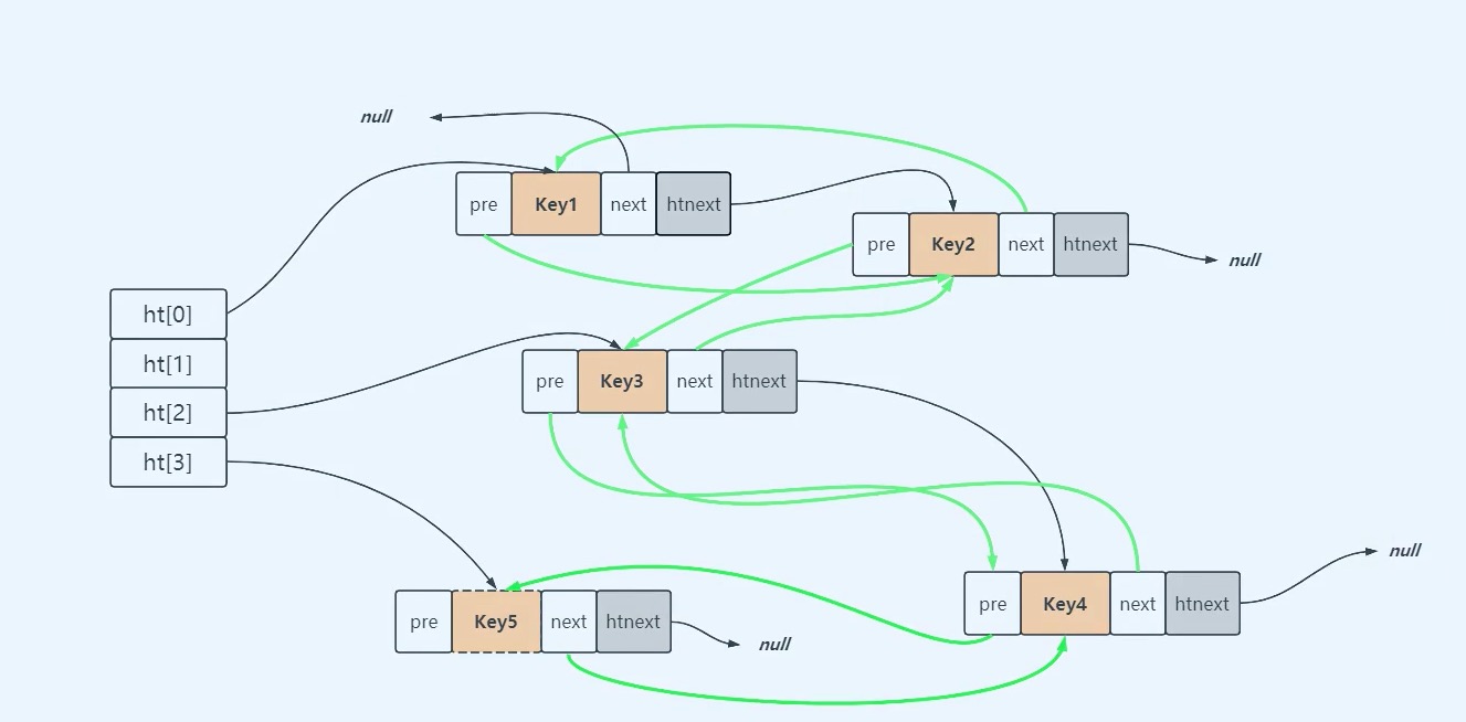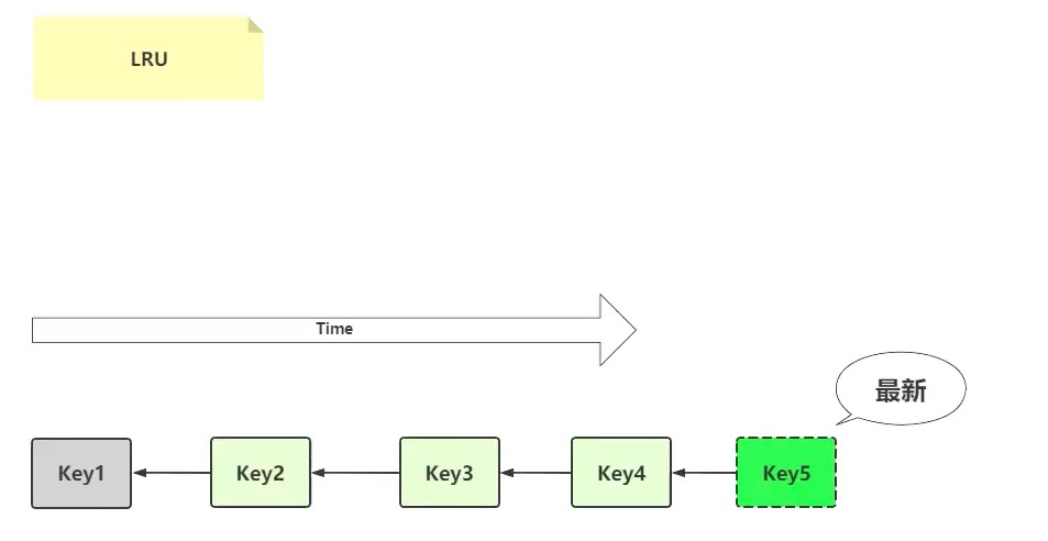 LRU算法通常通过双向链表来实现,添加元素的时候,直接插入表头,访问元素的时候,先判断元素是否在链表中存在,如果存在就把该元素移动至表头,所以链表的元素排列顺序就是元素最近被访问的顺序,当内存达到设置阈值时,LRU队尾的元素由于被访问的时间线较远,会优先踢出