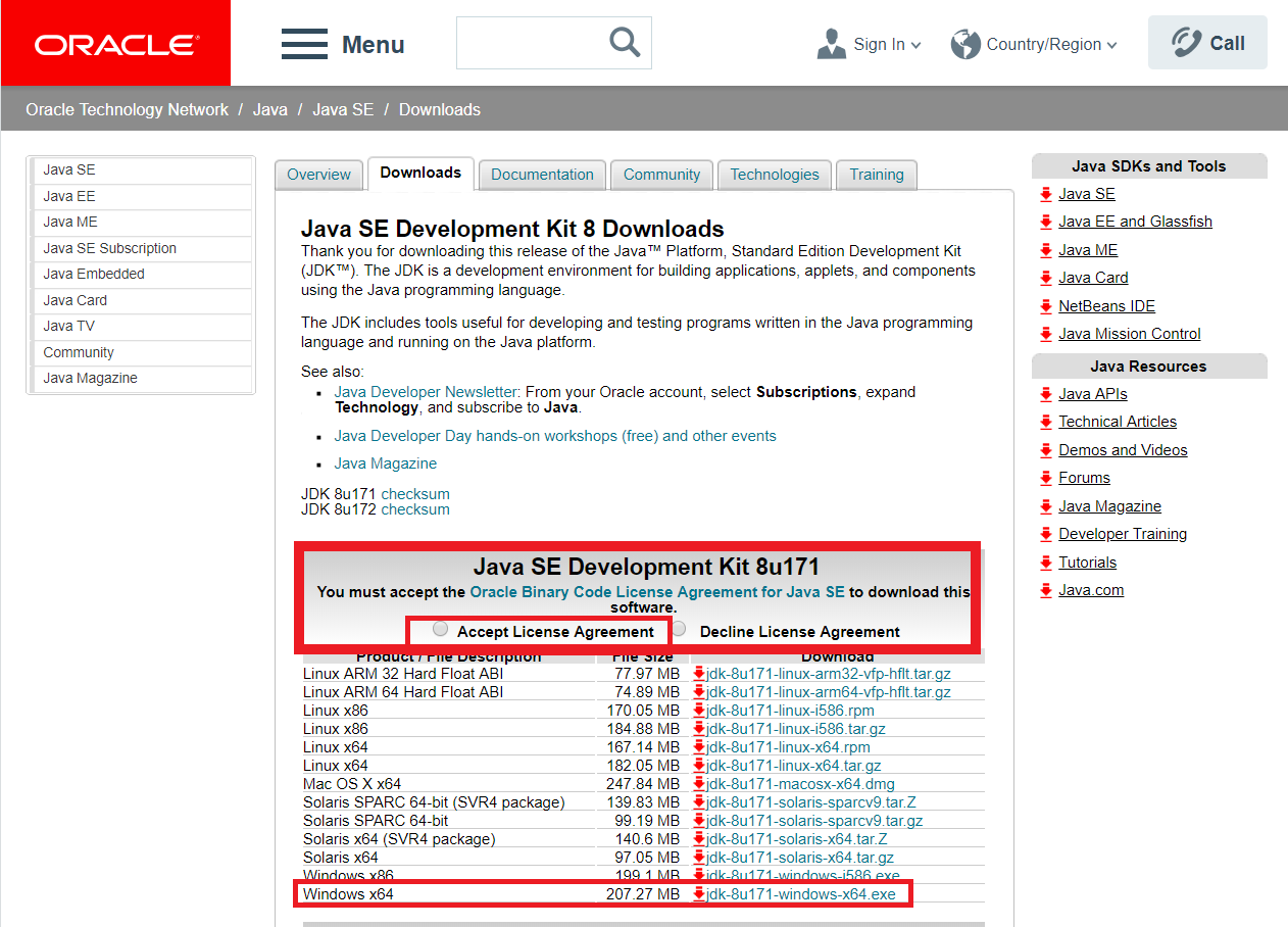 按照红色方框的指示,先选中 [Accept License Agreement],表示同意安装使用协议;选择Windows x64(即64位操作系统),点击下载;等待下载完成即可。