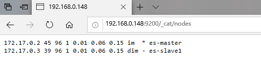 访问http://IP:9200/_cat/nodes确认查看ES集群信息,可以看到有主从节点部署成功: