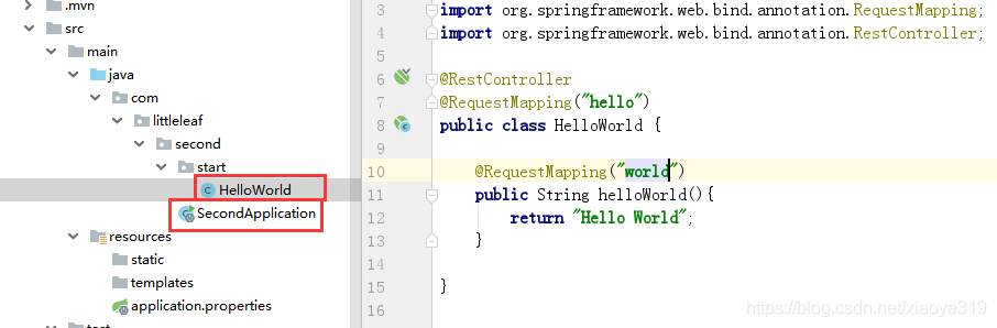 我简单写了一个HelloWorld类,使用的注解都是我们常用的注解,跟Spring的注解没什么区别唯一的就是@RestController,它意思就是 Controller 里面的方法都以 json 格式输出,不用再写什么@ResponsBody了,可以理解为@RestController就是@Controller和@ResponsBody的综合体。