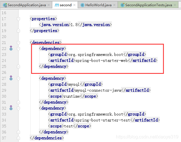 由于构建项目时,我选择了web、mysql这两个组件,所以pom.xml中能看到这两个相关的依赖,创建的springBoot由于是maven项目因此会自动下载下来,这里就能直接使用了。