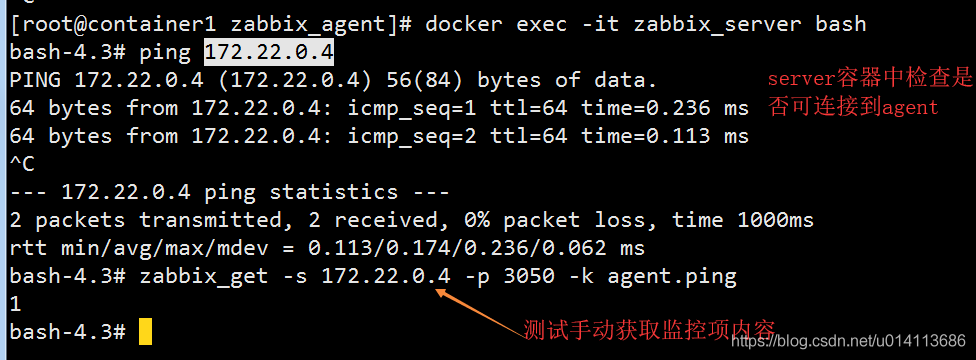 首先启动zabbix_agent后,在server/proxy容器中先测试一下该agent是否可到达: